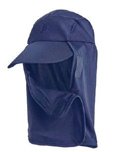 顔の両側、首の部分まで完全に覆ったUPF50+のハット。UVA/UVB放射の98%をブロック。顔の部分の布はマジックテープで開閉が可能になっているので、日差しの強い時だけ目出し帽として被るのでOK。パッカブルでウォッシャブルなので、真夏のスポーツに最適だ。