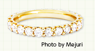 ダイヤモンドを惜しげもなく使ったゴールドのエタニティーリング。どんなスタイリングにもなじむエレガントなデザインは長く愛用できるだろう。ちなみにこの「MEJURI」は、透明性のある価格設定で注目を集めているブランドだ。