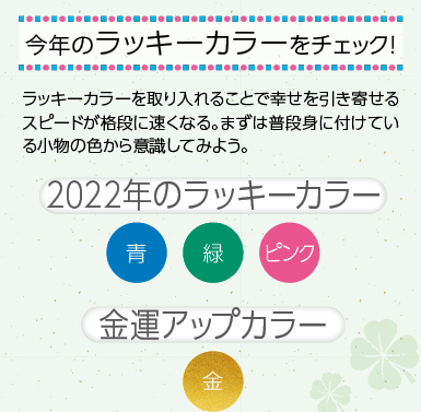 風水的、星回り的に見て今年のラッキーカラーは「青・緑・ピンク」(前出の菊桃ヨさん)。寒色の緑や青は自然の色でもあり、癒しや落ち着きをもたらす色と言われ、暖色のピンクは優しさや愛らしさをイメージする色だ。金は鉄板の金運アップのカラーで、いつでもラッキーカラーとされている色。この4色を身に着けることで幸運を引き寄せるスピードが速まるという。財布や名刺ケースといった革小物は新年に新調すると縁起が良く、ラッキーカラーを取り入れてみてもいいだろう。