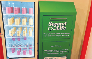 そんな店内の一番奥に、リサイクルボックスが設置されている。このリサイクルプロジェクトはアメリカのみで展開。リサイクルすると新しい下着を20%OFFで購入できる。どんなブランドの商品でもリサイクルが可能だが、水着やブラレットは不可。店頭に行かずともオンラインで無料キットを注文し、チェックアウト時に「Free Second Life Shipping」を選択することで利用できる。1回の注文につき3枚まで、きれいな古い下着を入れた袋を返送し、完了!