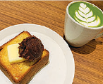 人気メニューの黒蜜入り抹茶ラテとあずきトースト