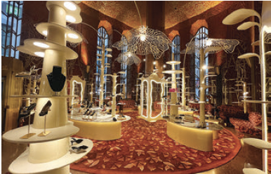 特にアイコニックな売り場となる「レッドルーム」は、同ビルが建築された当時、画家のヒルドレス・メイエールによってアールデコ洋式でデザインされた空間で、1200平方メートルの壁に赤やオレンジ、金の色調の精巧で美しいモザイクタイルがちりばめられている。中央には美しいフォルムの棚が設置され、そこにラグジュアリーブランドの靴が並ぶ、まさに芸術とファッションが融合した壮麗な空間である。現在この「レッドルームは」は、ニューヨークのランドマークインテリアに指定され、プランタンの一部として一般公開されている。