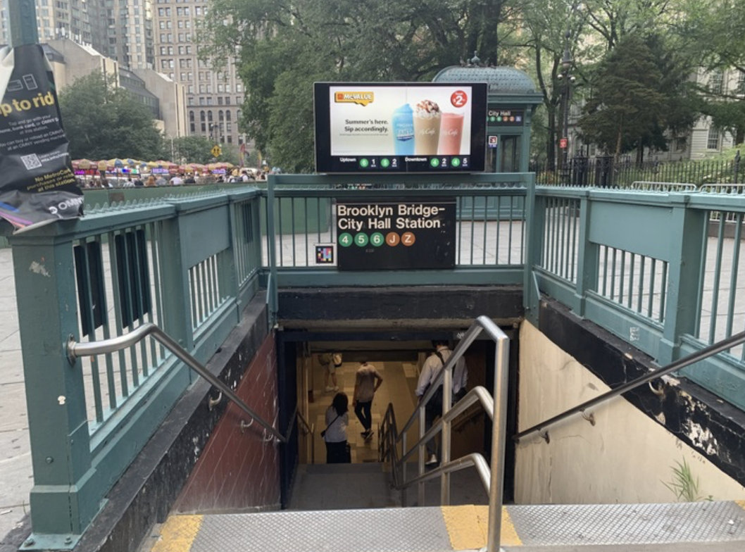 地下鉄6ラインの終点である同駅は、ブルックリン橋に近く、その歩道入口前にはフードトラックやお土産グッズの路上販売がずらりと並ぶ。市庁舎公園や歴史的建造物が広がるエリアに位置し、裁判所や行政関連のオフィスビルも多いため、昼間は観光客や通勤者で賑わい比較的安全だが、夜は人通りが少なくなるため注意が必要だ。近くには廃駅となった旧シティホール駅があり、交通博物館の会員になることが参加の条件で、年3回のみ販売される入手困難な旧市庁舎駅ツアーも開催されている。