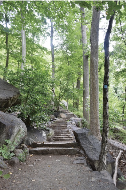 湖の周りを半周ほど歩くと、山頂に続くトレイルの入り口が見えてきた。ベアマウンテンは、アパラチア山脈ををつなぐ「アパラチアントレイル」が通っている。山頂までは1時間ほどで到達するというが、高低差はなかなか本格的。序盤は軽装で歩けるが、踏破を目指すなら服装を整えて。