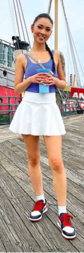つま先部分が黒になった 「ブラック・トウ」 シリーズは2019年を最後にリリースされたが、今夏、ローカットモデルをベースに再リリース。争奪戦が必至のモデルをミニスカートと合わせてスタイリングした。不動の人気を誇る「エア・ジョーダン1」は男女ともに注目されている。