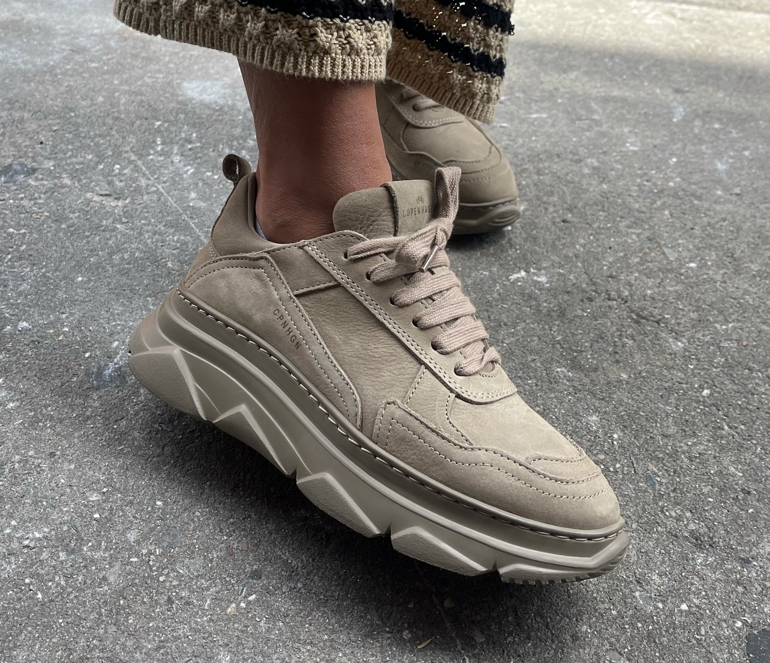 ハーゲン・スタジオズ靴職人の兄弟がコペンハーゲンで設立した、環境に優しい素材を使用し、過剰製造はしないなどの取り組みを掲げるブランド。ベージュのスエードを使ったスニーカーがエレガントなスタイリングにもマッチしている。
