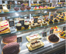 お客の目の前で次々焼き上がる自家製パン。種類豊富なスイーツも繊細なつくりで日本のケーキ店を思わせる