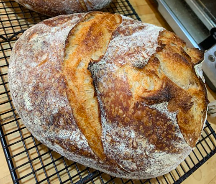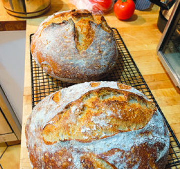 オーブンで一番大切なのは、十分な時間をかけて、パン焼き鍋を入れたまま焼き上がり温度以上(500°F)に予熱することだ。鍋は一旦取り出し、発酵の完了した生地を入れるのだが、鍋を戻すためにオーブンを開ける時、温度はちょうど焼成適温の450°Fまで下がる。鍋の質はあまり関係ない。安い鋳物の鍋と、お洒落だけど古くて欠けたホーローのダッチオーブンを使っているが、どちらでも同じようにうまく焼けるという。「オーブンは私の最高のパートナーで、発酵中の小さな欠点をいつも補ってくれます。生地の発酵に過不足があってもオーブンがそれを補正してくれて、必ず正しい大きさのパンが焼けるのです」