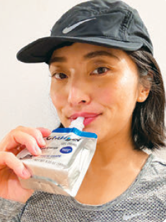 「チャージェル」はクラスの前に飲んでいます。クラスの前に空腹を感じたり、逆にお腹をいっぱいにしてしまうとパフォーマンスに影響するので、それを避けるためにはちょうどいいです。私はアップル味をよく飲みます。こんにゃくゼリーのように飲みやすく、腹持ちもとてもいいです。