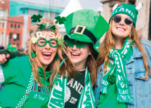 緑の服やアクセサリーを身にまとった人で溢れる街中。 多くの見物客が集まるパレードやアイリッシュパブやレストランなどでは特別イベントなどが開催され、街はお祭りムード一色!