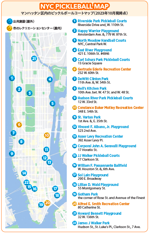パブリックコート、オープンプレーなど、ニューヨーク市内でピックルボールが楽しめるロケーションの詳細や、イベント、セッションの予定もNYCピックルボールのウェブサイトにいけばチェックすることができる。また、グッズやおすすめブランドも紹介されており、お得な価格で購入できる。ピックルボール好きが集い、プレーを楽しむために必要な情報が掲載されているコミュニティーとなっている。NYCピックルボールのファウンダー、エリック・ホーさんのプライベートレッスンなどもサイトを通じて予約できる。