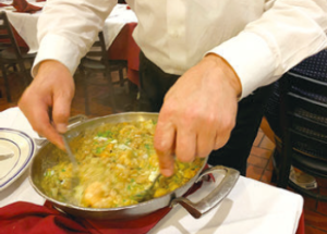 ポルトガル名物の魚介のパン粥「アソルダ・デ・マリスコス」はテーブルで最後の仕上げをしてくれる