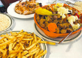 時計回りに「フランゴ・デ・シュラスコ」「カルネ・デ・ポルコ・ア・アレンテジャーナ」。フライドポテトも大盛り