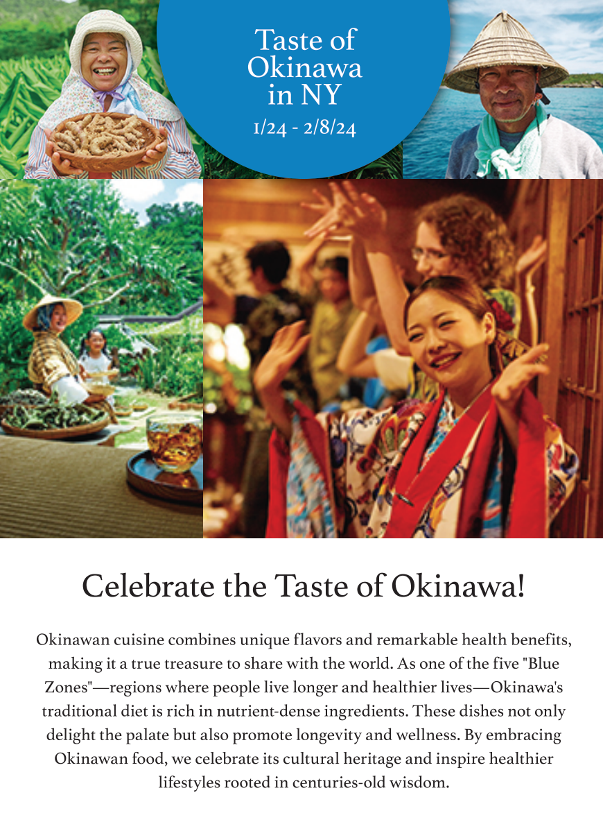 日本の最南端に位置する沖縄は「ブルーゾーン」として世界的に知られる長寿地域であり、その伝統的な料理は栄養価の高い食材と豊かな風味で、健康を促進しながら美食の楽しみを提供します。今回のフェアでは、シークァーサー、もずく、黒糖など、沖縄特有の食材を使用した料理を提供し、健康志向のニューヨーカーに新たな食のインスピレーションをお届けします。さらに、料理を引き立てる沖縄を代表するオリオンビールも、一部店舗にてお楽しみいただけます。