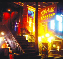 個室とオープンバーから成る「Sing Sing St. Marks Karaoke」は、こじんまりと温かい雰囲気がどことなく日本のスナックを彷彿させるカラオケ店。個室も良いが、オープンバーにある巨大スクリーンを見ながら、見ず知らずの他の客たちと一緒に歌を大合唱して盛り上がるのも、楽しい醍醐味だ。
