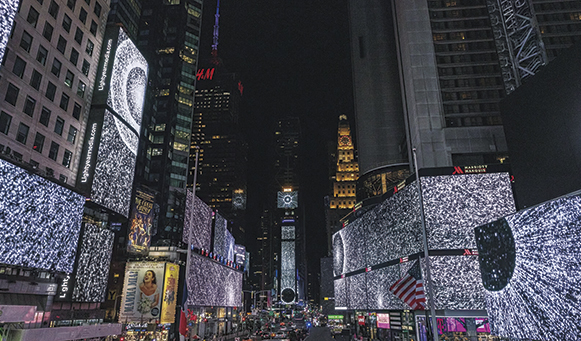 タイムズスクエアで毎晩ひっそりと行われる“深夜の儀式”をご存じだろうか。午後11時57分になると、周囲を埋め尽くす90台以上の巨大デジタル看板が一斉に広告を止め、アート作品だけを映し出す。それが「ミッドナイト・モーメント」だ。午前0時までのわずか3分間、喧騒の街がふっと呼吸をゆるめ、巨大な屋外ギャラリーに変わる特別な時間だ。