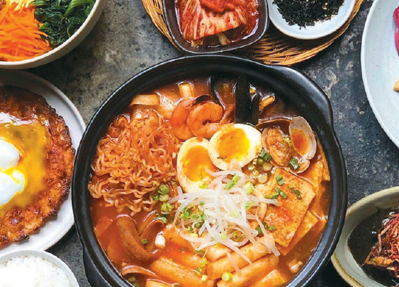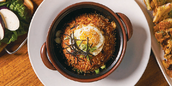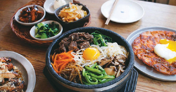 印象的な店名のこのお店は、コリアンタウンから1ブロック離れたところに位置するにもかかわらず、客が途切れず来店する人気店。本格的な韓国家庭料理は、ほっとするオンマ(おふくろ)の味を彷彿とさせる。