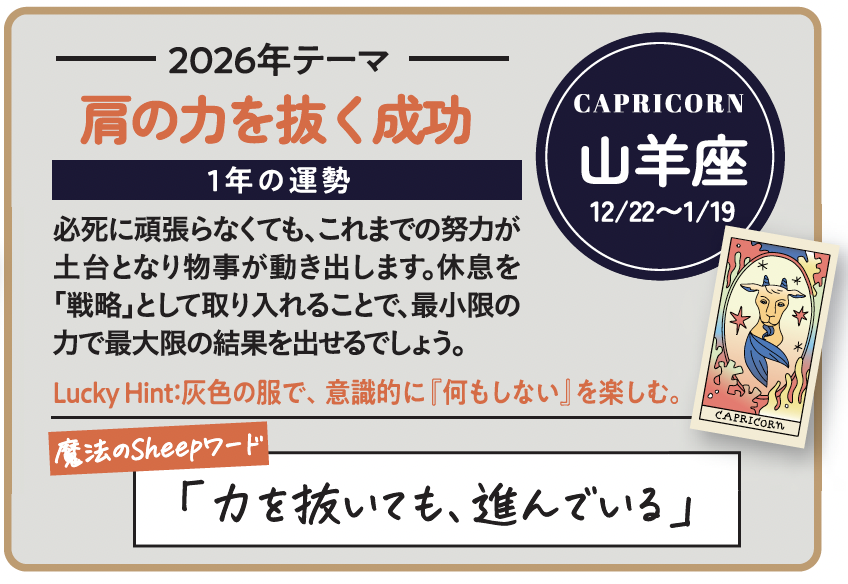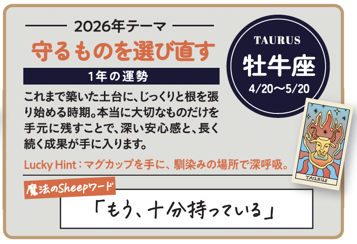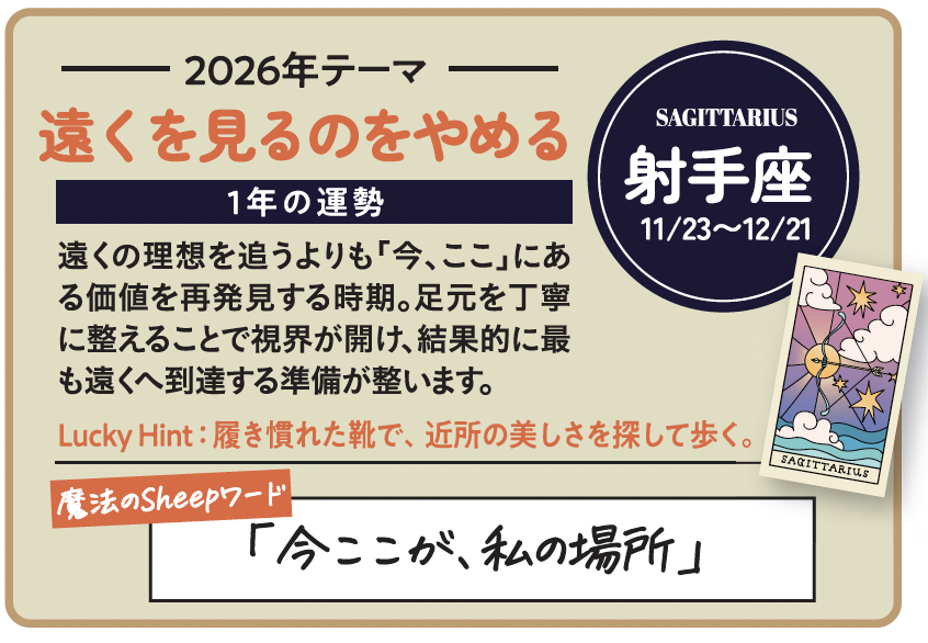 そして2026年。いくつもの大きな惑星移動を経て、星の流れははっきりと「次の時代」へ舵を切ります。ここで求められるのは、無理に拡大する力ではなく、納得して選び直す力。スピードや肩書き、規模の大きさよりも、「自分がどこに立ち、何を続けたいか」を理解している人ほど、結果的に遠くまで進める配置です。