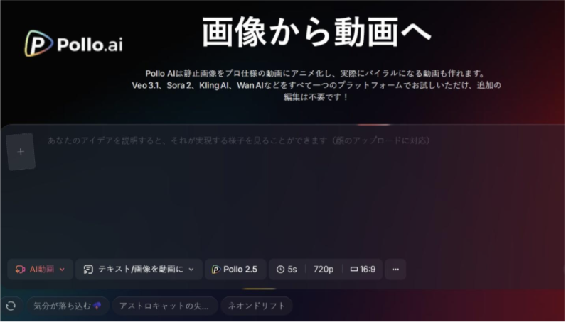Pollo AIは、画像から動画へを簡単かつ高品質に実現できるオールインワン型の画像から動画AIプラットフォームであり、無料でも利用可能な点が大きな特徴です。ユーザーは画像をアップロードし、簡単なテキストプロンプトを入力するだけで、AIが構図・動き・カメラワーク・空間表現を自動解析し、「画像から動画へ」と自然に変換してくれます。特に従来のツールと異なるのは、単なるアニメーション化ではなく「物語性を持った映像」として仕上がる点であり、SNS投稿や広告素材としてそのまま使用できるクオリティに達していることです。さらに音声付き動画生成にも対応しており、BGMや環境音、効果音まで自動生成されるため、映像全体の没入感が大幅に向上します。