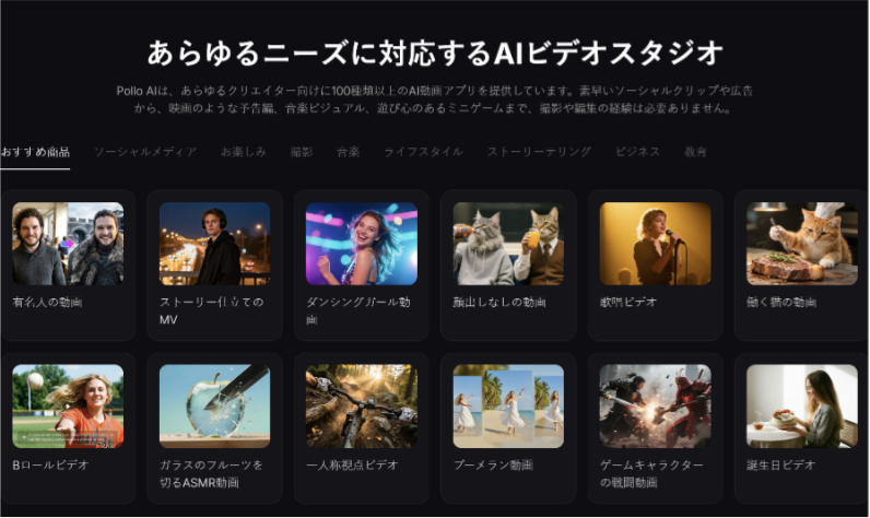 またPollo AIは単一モデルではなく、Pollo 3.0を中心にVeo、Sora、Kling、Runway、Luma、Pikaなど業界最先端の複数AI動画モデルを一つの環境で利用できる点が大きな強みです。これによりユーザーは別々のプラットフォームを行き来する必要がなく、同じ「画像から動画へ」という生成プロセスの中で異なるモデルの出力を比較しながら最適な映像スタイルを選択できます。さらに100種類以上のAI動画アプリを統合した“AIビデオスタジオ”として機能しており、短尺SNS動画から広告、映画風トレーラー、アニメーション、商品プロモーションまで幅広い用途に対応します。初心者でも直感的に操作できる設計になっているため、専門知識がなくても高品質な画像から動画へ制作が可能です。