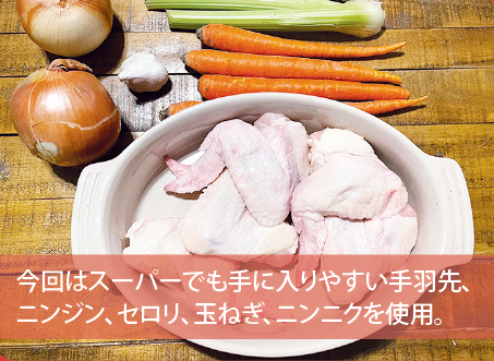 まずはアクの多い手羽先約1キロを水から入れて沸騰させます。アクが出てきたら取ってください。それから、フランス料理でいうガルニチュールアロマティックとして、基本的には玉ねぎ、にんじん、セロリを、1対0・5対0・25の割合で入れます。あれば皮付きニンニクを半分に切ったもの(4分の1個)ローリエ、タイムも加え、再び沸騰させてまたアクが出てきたらアクを取る作業を繰り返します。