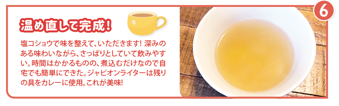 このブロスを基にプロが実際に作った格別のスープは、同レストランで食べられるので、ぜひ足を運んでもらいたい。