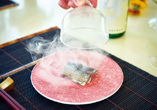 美しい盛り付けに加え、スモークをたいたり、金粉が出る割り箸、色が変化するおちょこなどを取り入れたりといったエンターテインメント性に富んだ演出も人気の理由だ。