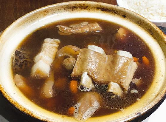 マレーシアとシンガポールで20世紀初め頃から常食されている薬膳スープ。「中国・福建省の肉料理ニウパイ(牛排)が原型」「マレーシアの港湾労働者向けのスタミナ料理として生まれた」「福建省出身の漢方医が病弱な息子のために療養食として考案した」などと、その起源については諸説ある。材料は、豚の皮付きあばら肉と耳、足をガーリック、スターアニス、高麗ニンジン、シナモン、クローブ、コショウなどの香辛料。味は地域(広東、福建、巴生[クラン])によって異なり、広東風はコショウとニンニクで仕上げ香辛料は使わない。福建風は甘めの醤油で味付け。巴生風は、香辛料の他に油揚げや野菜が入るそうだ。