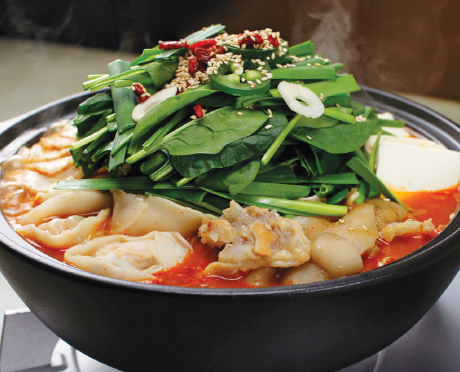 「とんとんホットポット 赤(38ドル〜)」プリプリで臭みのない新鮮なもつは弾力と旨味が違う。もつの旨味と野菜のあまみが染み込んだスープに、〆はご飯又はちゃんぽん、うどんかが選べる