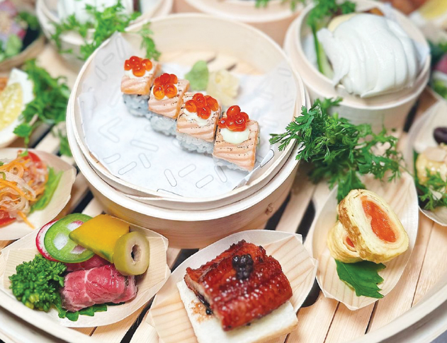 「飲茶セット(27ドル)」水餃子、エビマヨ、角煮バンズなど計11品に好きなお茶がついたブランチのセットメニュー。