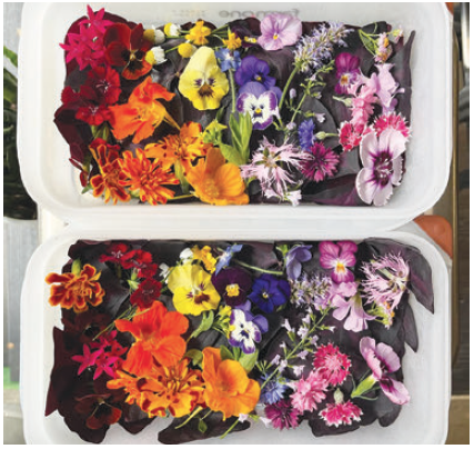カラフルな食用花は回収可能な容器に入れられ、購入することができる。家庭料理に彩りを加えてみては