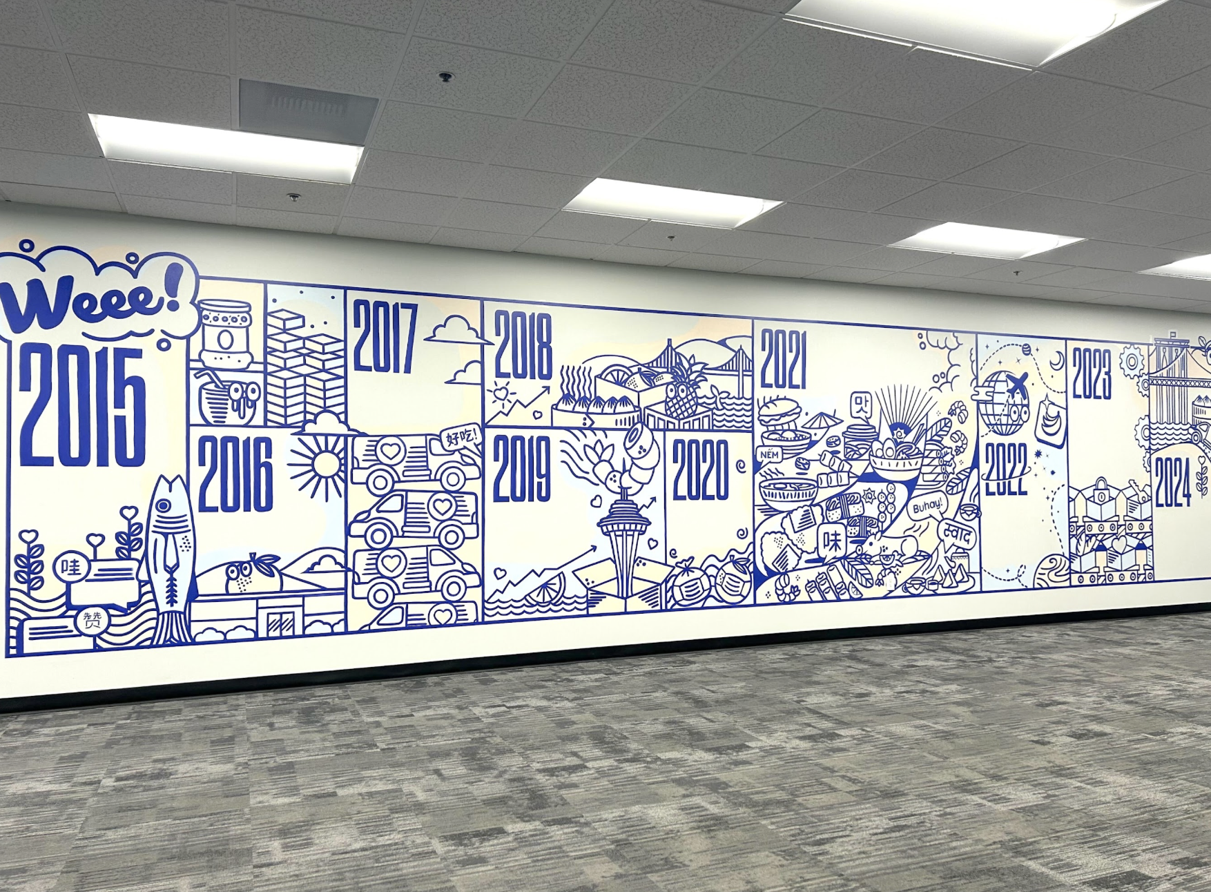 『廊下には2015年からの歩みをまとめたイラストがずらっと並んでいます。通るたびに会社の成長を実感します。』(曽我)