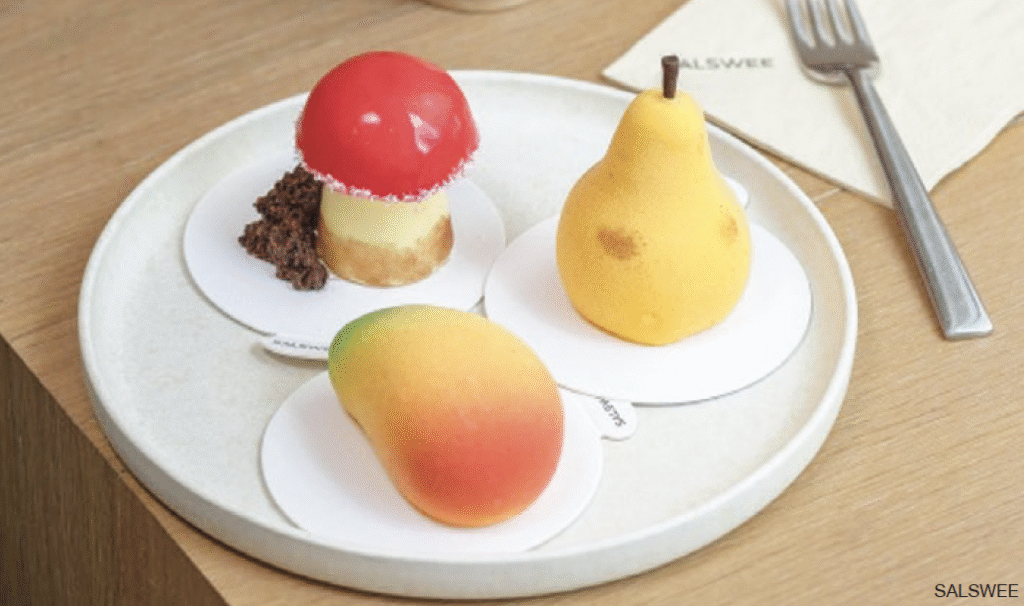 「マンゴー(11ドル95セント)/梨(9ドル95セント)/マッシュルーム(11ドル95セント)」マンゴーは新鮮なマンゴークーリとホイップマンゴーガナッシュフィリングが素材の味をしっかり引き出す。マッシュルームはストロベリームースとバニラムースを使用