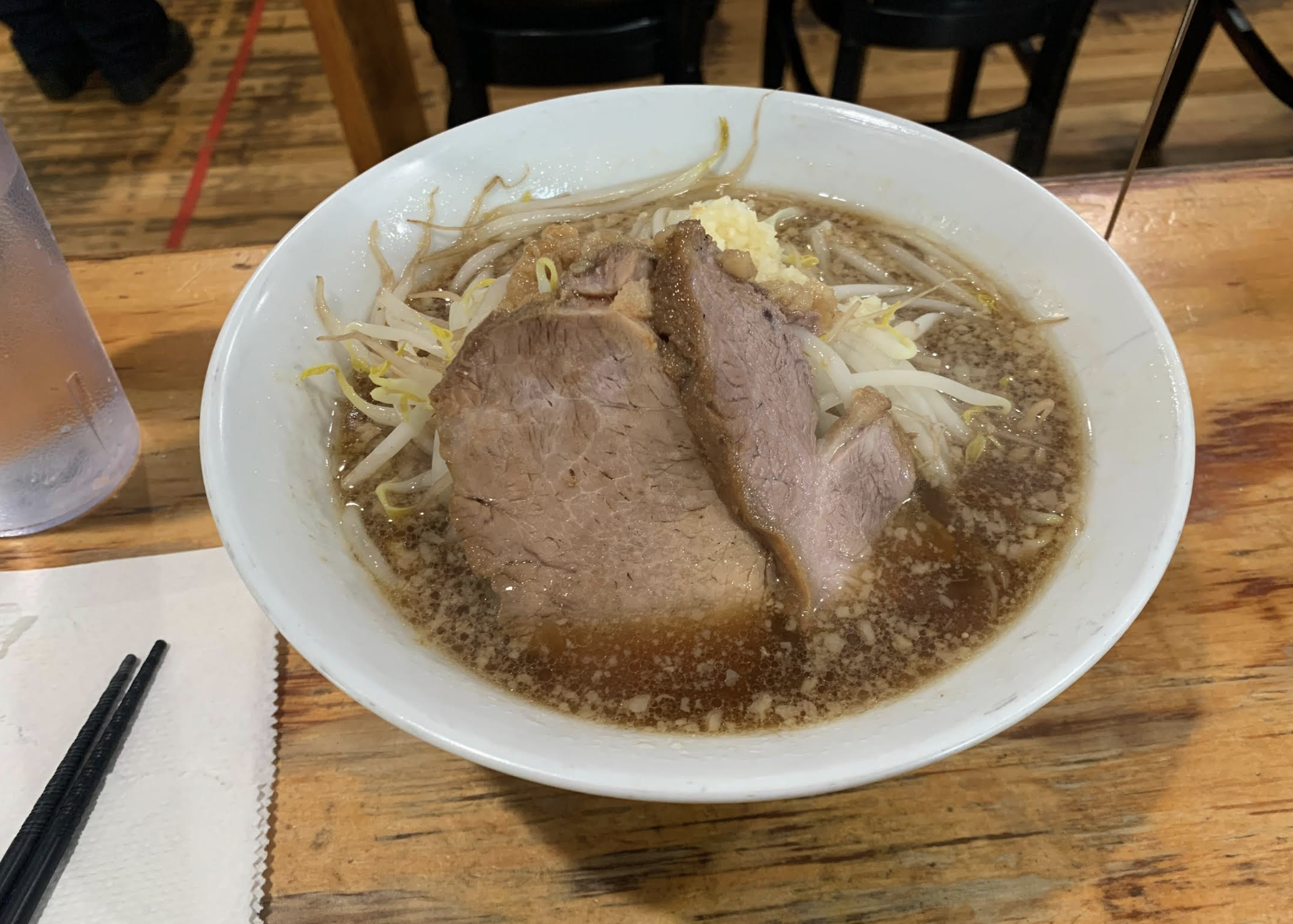 とある土曜日の昼前、編集部が同店を訪問。開店を待つ列には15人ほど。18席の店内に6名ずつ案内され、席に着く前にオーダーが始まる。メニューは「二郎系ラーメン」にインスパイアされた濃厚でにんにくたっぷりの豚骨醤油ラーメン。チャーシューの枚数(2枚・5枚)によって価格が異なり、麺の量も調整可能だ。注文時に支払いを済ませると、「夢の共有」に参加するかどうか聞かれる。