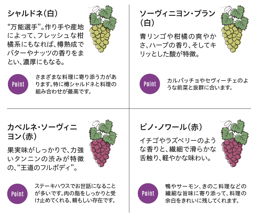 最初の入口として最も役に立つのが、この4品種。 ワイン選びや対話のツールになるので、まずここ だけ覚えれば十分です。
