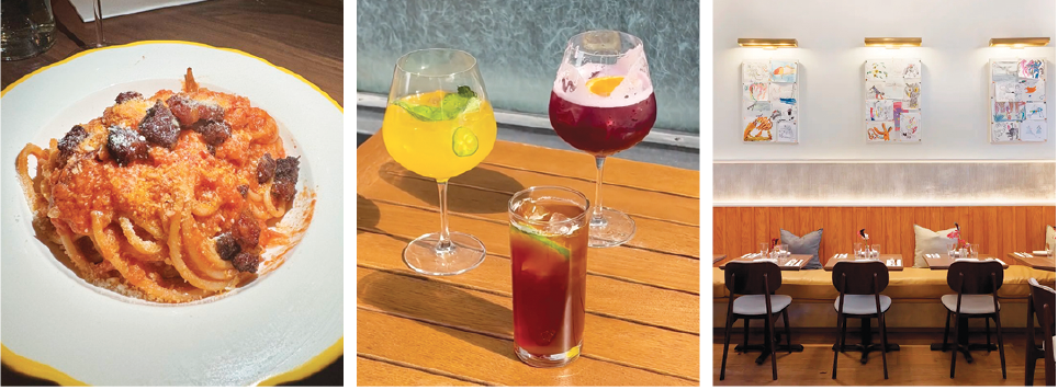 (左)ブカティーニ・アル・アマトリチャーナ(中)カクテルも種類豊富(右)近隣の子供たちの作品が飾られたメインダイニング