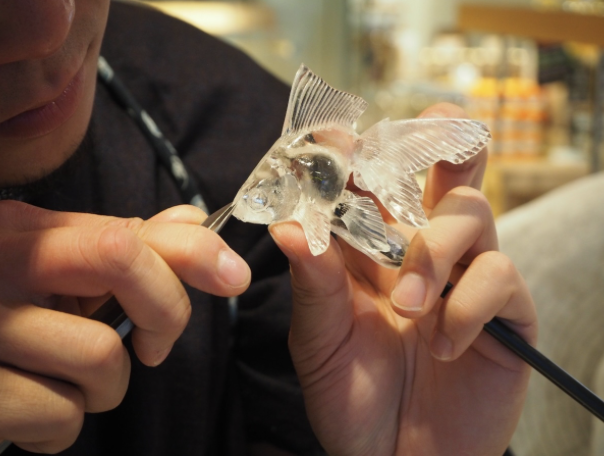 魚のひれや鱗まで再現された緻密な造形、繊細な濃淡が息づく鮮やかな色彩。360度どこから見ても美しい飴細工は、思わず見入ってしまうほどの完成度です。型を使っているように見えますが、実は職人の手と握りバサミだけで作られる純粋な“手仕事”。90度に温めた飴を2〜3分のうちに成形するため、火傷の危険と隣り合わせの真剣勝負。短い時間で命を吹き込むからこそ、唯一無二の表情が生まれます。日本の伝統美を凝縮した飴細工は、海外の方に喜ばれること間違いなし。食べるのは勿体ないですが、もちろん美味しくいただけます。