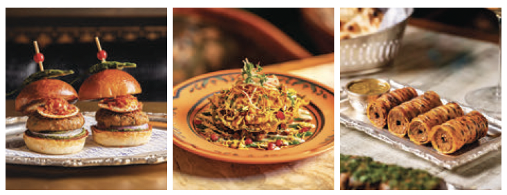 (左)シャミ・バン・ケバブ(中)スパイスと酸味のバランスが心地よい、軽やかな前菜『パーン・パッタ&カラ・チャナ・チャート』(右)叩いたラム肩肉をナンで包んで焼き上げる「ワルキ・ラム・シーク・ケバブ」
