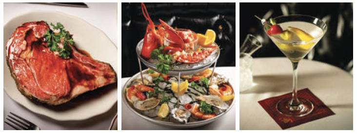 (左)クラシック・プライムリブステーキ(中)見た目も華やかなシーフードタワー(右)クラシック・マティーニ