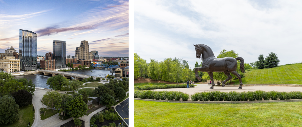 グランドラピッズは人口約20万人のミシガン州第二の都市。ミシガン州最大の川、グランドリバー沿いに立ち並ぶダウンタウンは、都市の雰囲気がありながらも穏やかで自然と融合した街並みが魅力。家族連れでも存分に楽しめる「Grand Rapids Children’s Museum」ではインタラクティブな展示が人気。また、「Frederik Meijer Garden & Sculputure Park」では日本庭園や巨大彫刻アートが、初夏の「John Ball Zoo」ではランタンフェスティバルが出迎えてくれる。
