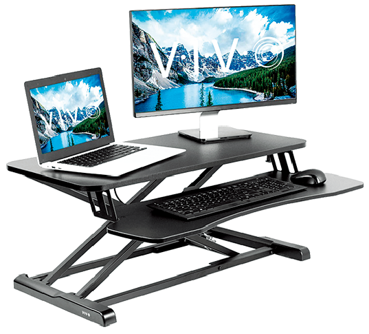 机の上に乗せて使えるタイプのVIVO (vivo-us.com)のスタンディングデスク・コンバーターはAmazon.comでもイチオシの商品。高さを自在に調節できるので、自分の体に合わせてカスタマイズできる