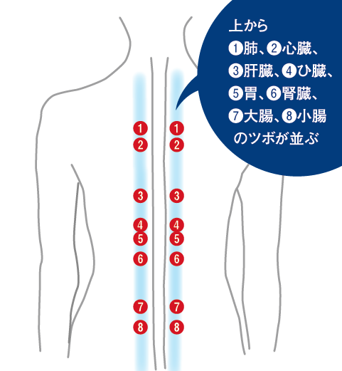「背骨から3センチほど離れた左右両側に『ぼうこう経』という経絡(*注参照)があります。そこには上から下まで肺、肝臓、ひ臓、胃、大腸といった内臓に効くツボが勢ぞろいしているんです。そこは東洋医学的には経絡ですが、自律神経(交感神経)も通っているんです。ここを押して刺激すると、内臓全体の不調や自律神経のバランスを調えられます」と野崎さん。