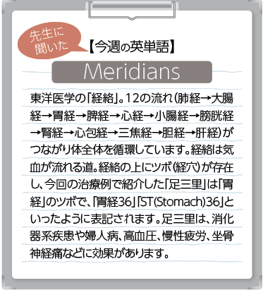 まず週に2回鍼治療に通ってもらい、ストレスを緩和するツボ、血の循環を良くするツボ、そして慢性疲労などを緩和する一種の万能ツボである「足三里」(両膝下から指3本分くらいの位置)に鍼を打ち、クリニックでの治療中はゆっくり休み、リラックスしてもらいました。1カ月たったころにはストレスが緩和され、精神が安定してきました。そうすると夜眠れるようになり、頭痛と腰痛もほとんど治まり、その後はメンテナンスのために月1回通ってもらっています。