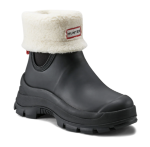 Hunterの足首丈スノーブーツ。防水仕様で雨雪も安心、ムートン裏地が暖かく快適。安心感あるソールで歩きやすく、冬の外出に活躍する定番アイテム。