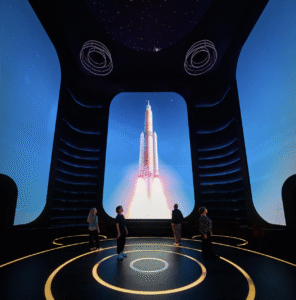 最初のテーマ「つながり」では、米国が世界中の人々と教育・文化を通じて交流しているプログラムを紹介。続く「イノベーション」では、スパークとユースアンバサダーによる案内で、米国発の最先端技術を紹介。環境に適応した次世代の食料システム、革新的な新素材、生活を向上させる医療技術など、米国がいかにして世界の課題に対しソリューションを提供しているかを学べる。「旅」のセクションは、巨大スクリーンによる没入型体験が魅力。グランドキャニオンなどの国立公園から、活気あふれる都市(もちろんニューヨークも!)、フェスティバルやスポーツ、各地のローカルフードまで、米国全土の魅力が次々と映し出され、「美しき米国」の多様な物語に引き込まれる。クライマックスとなる「宇宙」では、アポロ計画など米国が宇宙開発で果たしてきた役割をダイナミックに紹介。特に、キューブ型シアター内部で展開されるロケット打ち上げのシミュレーションは圧巻。没入型の映像と音響、そしてシネマティックな照明演出により、まるで本当にNASAの発射施設にいるかのような高揚感が味わえる。展示はケネディ宇宙センターに着想を得ており、発射の瞬間に向けて高まる緊張感と期待感を周りの来場者と共有した。そして最後は、アポロ17号が持ち帰った本物の「月の石」の展示。人類が成し遂げた偉業の記憶が、静かに語りかけてくるのだ。